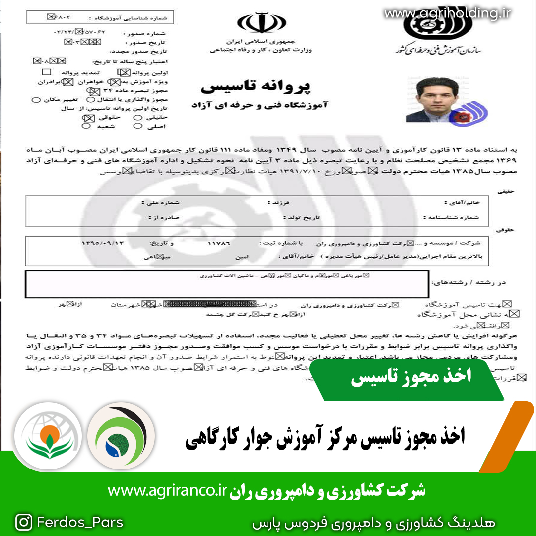 به گزارش روابط عمومی شرکت کشاورزی و دامپروری ران، در راستای اجرای سیاستهای کلی بنیاد مستضعفان انقلاب اسلامی و همچنین به منظور توسعه مهارتها و افزایش تخصص کارکنان، این شرکت موفق به اخذ مجوز تأسیس مرکز آموزش جوار کارگاهی از سازمان فنی و حرفهای شده است.