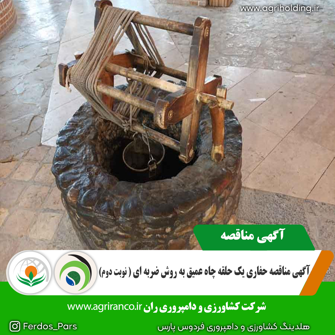شرکت کشـاورزی و دامپـروری ران درنظــردارد نسبت به بکارگیری پیمانکار جهت حفاری یک حلقه چاه عمیق به عمق ۱۷۰ متر به روش حفاری ماشینی- ضربه ای به آدرس فیروزکوه-کیلومتر ۸ جاده فیروزکوه – قائمشهر – واحد فیروزکوه بشرح مشخصات مندرج در برگ شرایط مناقصه از طریق برگزاری مناقصه عمومی (تجدید نوبت اول)اقدام نماید. متقاضیـان می توانند جهت دریافت فرم شرایط شرکت در مناقصه به آدرس محل برگزاری مناقصه و یا به سایت شرکت به آدرس www.agriranco.ir مراجعه و یا جهت کسـب اطلاعات بیشتـر با شماره تلفن های زیر (مدیر بازرگانی-آقای البرزی) تماس حاصل فرمایند .