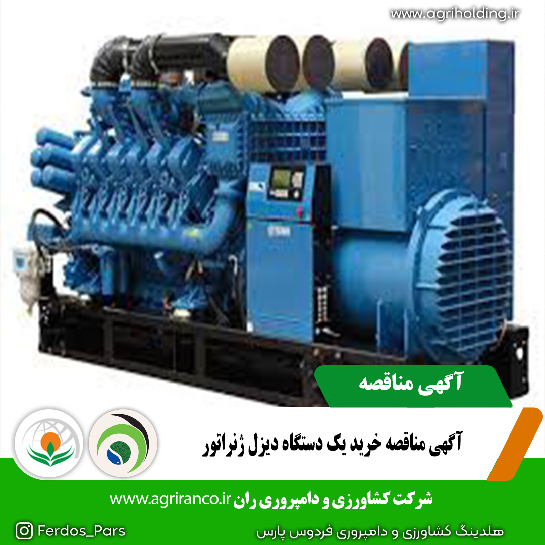 شرکت کشـاورزی و دامپـروری ران درنظــردارد، تعداد ۱ دستگاه دیزل ژنراتور بهمراه کلیه متعلقات آن را بشرح مشخصات مندرجات ذیل ازطریق برگزاری مناقصه عمومی خریداری نماید.