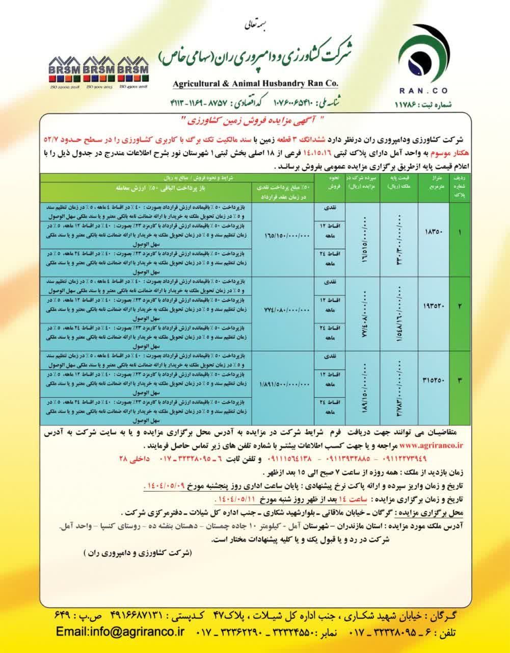 شرکت کشاورزی و دامپروری ران در نظر دارد شش دانگ سه قطعه زمین با سند مالکیت تک برگ با کاربرگ کشاورزی را در سطح حدود ۵۲/۷ هکتار موسوم به واحد آمل دارای پلاک ثبتی ۱۴، ۱۵، ۱۶ فرعی از ۱۸ بخش ثبتی ۱ شهرستان نور به شرح اطلاعات مندرج در جدول را با قیمت پایه از طریق برگزاری مزایده عمومی به فروش برساند. متقاضیان می توانند جهت دریافت فرم شرایط شرکت در مزایده به آدرس محل برگزاری به نشانی گرگان- بلوار شهید شکاری- جنب اداره مرکزی شیلات- شرکت کشاورزی و دامپروری ران( سهامی خاص )مراجعه فرمایند و یا جهت اطلاعات بیشتر با شماره های ۰۹۱۱۱۵۶۴۱۳۸- ۰۹۱۱۳۹۳۲۸۸۵- ۰۹۱۱۲۲۷۳۹۴۹ و شماره ثابت ۶-۰۱۷۳۲۳۲۸۰۹۵ داخلی ۲۸ تماس حاصل نمایند.