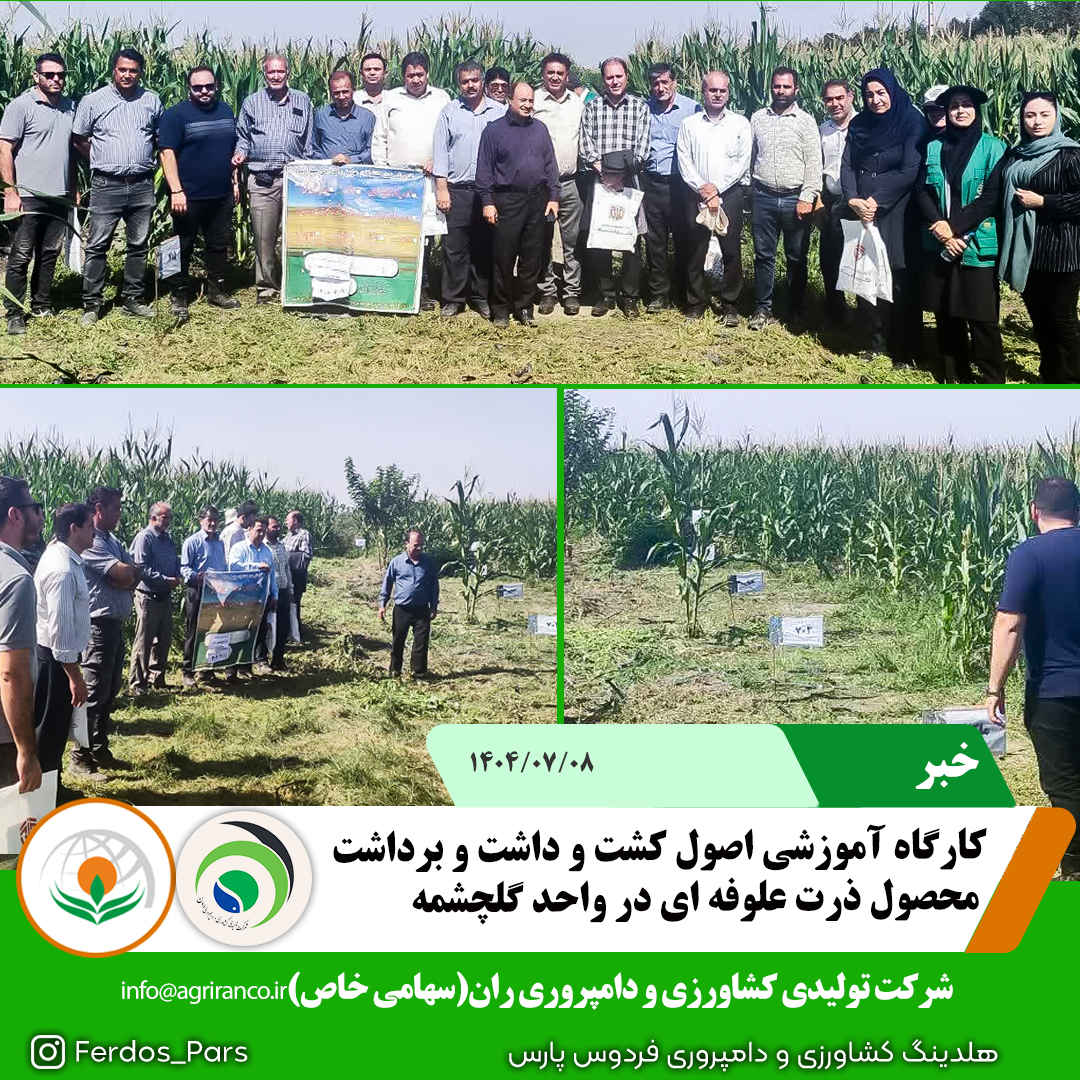 کارگاه آموزشی اصول کشت و داشت و برداشت محصول ذرت علوفه ای و بررسی ۸ رقم ذرت علوفه ای و اصول سیلو کردن ذرت با شرکت معاونت امور دام و زراعت استان و دامداران و کشاورزان منطقه در واحد گل چشمه در جهت ارتقاء کشاورزی شهرستان و استان. https://agriranco.ir #شرکت_کشاورزی_و_دامپروری_ران