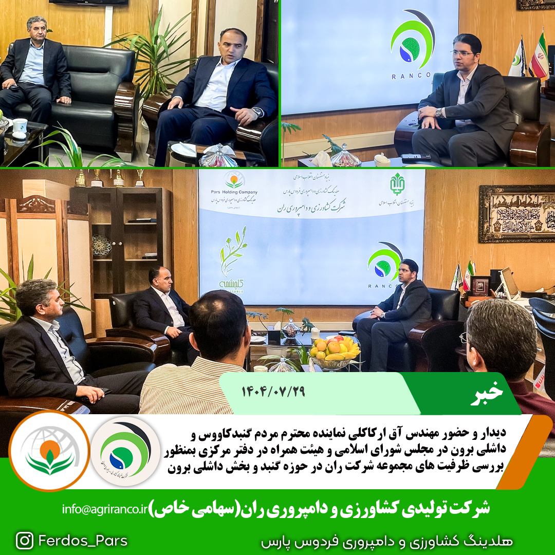 دیدار و حضور مهندس آق ارکاکلی نماینده محترم مردم گنبدکاووس و داشلی برون در مجلس شورای اسلامی و هیئت همراه در دفتر مرکزی بمنظور بررسی ظرفیت های مجموعه شرکت ران در حوزه گنبد و بخش داشلی برون.https://agriranco.ir #شرکت_کشاورزی_و_دامپروری_ران