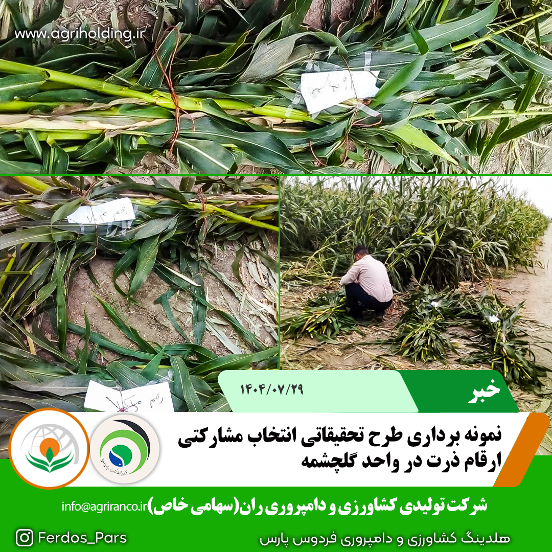 نمونه برداری طرح تحقیقاتی انتخاب مشارکتی ارقام ذرت در واحد گلچشمه این طرح در قالب مزرعه نمایشی و بدون تکرار اجرا با اهداف زیر انجام پذیرفت: ۱-انتخاب بهترین رقم برای توسعه کشت های آینده ۲-برسی عملکرد و مقاومت نسبت به تنش های محیطی ۳-بررسی خصوصیات فیزیولوژیکی و مورفولوژیکی ارقام شاخص های اندازه گیری شده عبارتند از: سطح برگ تعداد برگ ارتفاع بوته طول بلال تعداد دانه در بلال وزن بلال وزن کل بوته لازم بذکر است تمرکز این واحد بررسی ارقام کشتی است که درکنار موارد فوق حاشیه سود و بهره وری مالی را برای شرکت به ارمغان بیاورد و از کشت های سنتی و یکنواخت خارج گردد و به سمت کشاورزی با رویکرد صنایع صنعتی که دارای حاشیه سود بالا است تبدیل گردد. https://agriranco.ir #شرکت_کشاورزی_و_دامپروری_ران