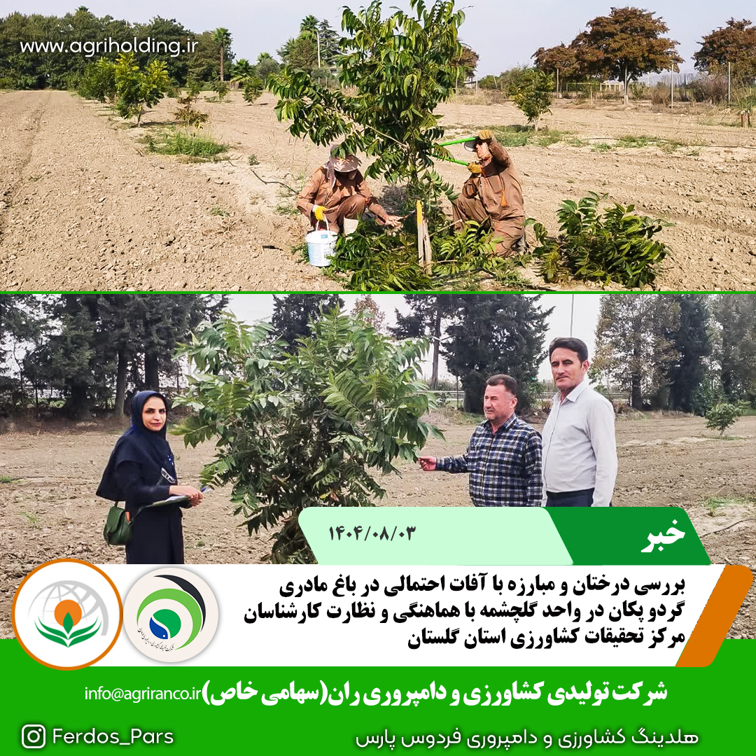 بررسی درختان و مبارزه با آفات احتمالی در باغ مادری گردو پکان در واحد گلچشمه با هماهنگی و نظارت کارشناسان مرکز تحقیقات کشاورزی استان گلستانhttps://agriranco.ir #شرکت_کشاورزی_و_دامپروری_ران