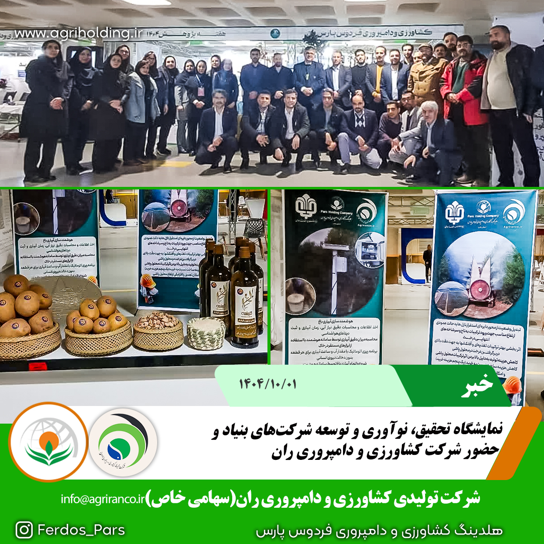 شرکت کشاورزی و دامپروری ران در نمایشگاه دستاوردهای تحقیق و توسعه بنیاد مستضعفان انقلاب اسلامی حضور یافت و آخرین دستاوردها و برنامههای پژوهشی خود را در قالب معرفی اقدامات انجام شده در حوزه اصلاحات ماشین آلات و هوشمند سازی آبیاری ارائه نمود. این حضور، گامی مؤثر در جهت ایجاد همافزایی و توسعه همکاریهای آینده در مسیر پیشرفت پایدار شرکت ارزیابی میشود. در این نمایشگاه جناب آقای دکتر دهقان ریاست محترم بنیاد مستضعفان و جناب آقای دکتر اسماعیلی ریاست محترم هلدینگ کشاورزی و دامپروری فردوس پارس از دستاوردها و فرآوردههای شرکت ران بازدید به عمل آوردند. https://agriranco.ir #شرکت_کشاورزی_و_دامپروری_ران