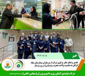 تقدیر و تشکر دفتر مرکزی شرکت از پرستاران بیمارستان شفاء به مناسبت ولادت حضرت زینب(س)Admin۶ آبان ۱۴۰۴تقدیر و تشکر دفتر مرکزی شرکت از پرستاران بیمارستان شفاء به مناسبت ولادت حضرت زینب(س). https://agriranco.ir #شرکت_کشاورزی_و_دامپروری_ران ... ادامه مطلب