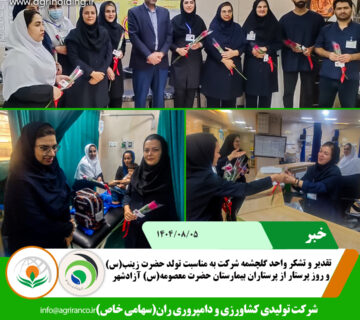 تقدیر و تشکر واحد گلچشمه شرکت از پرستاران بیمارستان حضرت معصومه(س) آزادشهر به مناسبت ولادت حضرت زینب(س)Admin۶ آبان ۱۴۰۴تقدیر و تشکر واحد گلچشمه شرکت از پرستاران بیمارستان حضرت معصومه(س) آزادشهر به مناسبت ولادت حضرت زینب(س)https://agriranco.ir #شرکت_کشاورزی_و_دامپروری_ران ... ادامه مطلب