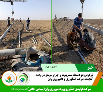 باز کردن و اجرا و مونتاژ دو دستگاه سنترپیوت در واحد گلچشمه شرکتAdmin۲۵ آبان ۱۴۰۴دو دستگاه سنترپیوت در واحد گلچشمه شرکت کشاورزی و دامپروری ران باز و مونتاژ شد. https://agriranco.ir #شرکت_کشاورزی_و_دامپروری_ران ... ادامه مطلب