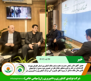 حضور جناب آقای دکتر رایجی مدیریت محترم بانک کشاورزی بهمراه کارشناسان در دفتر مرکزیAdmin۲۶ آبان ۱۴۰۴جناب آقای دکتر رایجی مدیریت محترم شعب بانک کشاورزی استان گلستان بهمراه کارشناسان بمنظور تبادل نظر در خصوص بهره مندی ... ادامه مطلب