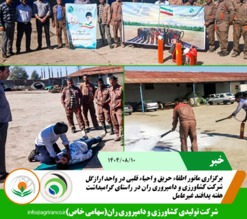 برگزاری مانور اطفاء حریق و احیاء قلبیAdmin۱۴ آبان ۱۴۰۴در راستای گرامیداشت هفته پدافند غیرعامل در واحد ارازگل مانور اطفاء حریق و احیاء قلبی صورت گرفت.https://agriranco.ir #شرکت_کشاورزی_و_دامپروری_ران ... ادامه مطلب