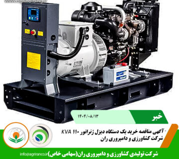 آگهی مناقصه خرید یک دستگاه دیزل ژنراتور KVA 110Admin۱۹ آذر ۱۴۰۴شرکت کشاورزی ودامپروری ران درنظردارد تعداد یک دستگاه دیزل ژنراتور KVA 110مورد نیاز خود را بهمراه کلیه متعلقات همراه آن ... ادامه مطلب