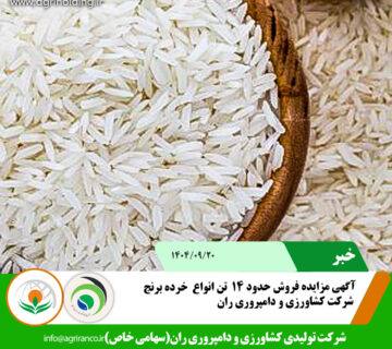 آگهی مزایده فروش حدود ۱۴ تن انواع خرده برنجAdmin۱۹ آذر ۱۴۰۴شرکت کشاورزی و دامپروری ران در نظر دارد حدود ۱۴تن خرده برنج طارم تولیدی سالهای ۱۴۰۳و۱۴۰۴خود را در انبار این ... ادامه مطلب